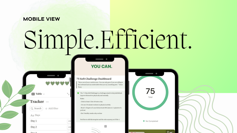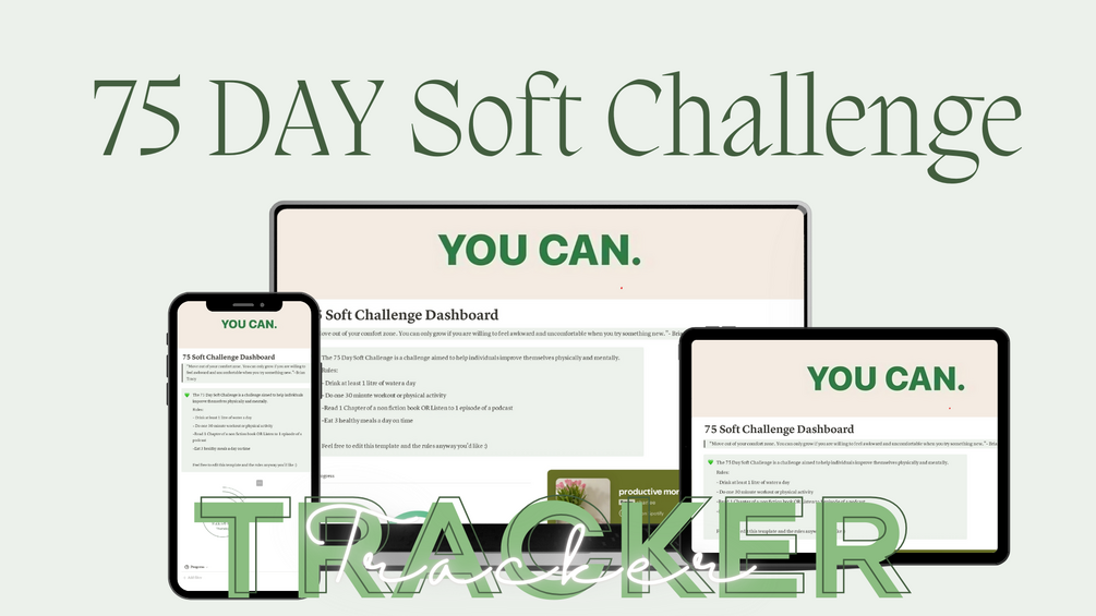 This notion template is designed to help easily keep track of the 75 Day Soft Challenge. I hope you find it useful đź’•All the best on your challengeđź’•