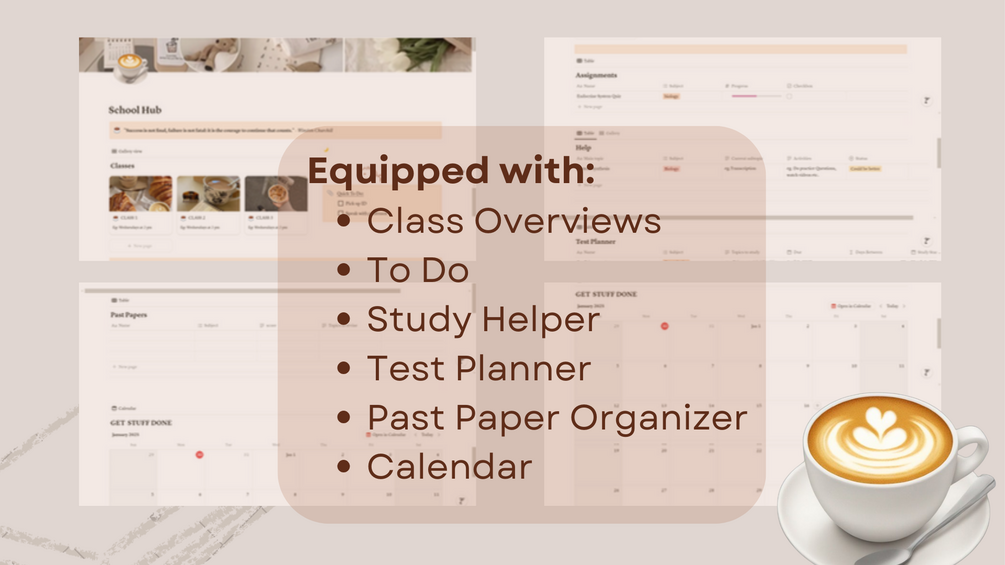 This template is for those seeking a simple way to organize school assignments, track topics you may struggle with and study planning. I'm someone who gets quite overwhelmed with notion templates with lots of sections so I made this template for people like me who want to organize their school life but in a simple and easy to track way. This template has an assignment tracker (that hides your assignment once you've completed it), a "Help" section that is meant to keep track of topics that you may be struggling with and may need to do additional activities to improve, a test planner and a Calendar. I hope someone finds this template as useful as I did and maybe it can make your life a little bit easier too ♥ .